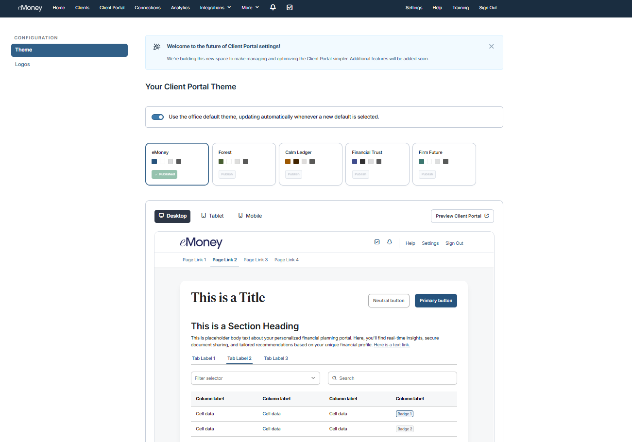 Start using the new Client Portal settings page to publish a new theme, manage your logos, and deliver a more consistent client experience across your book of business. Watch for more exciting Client Portal settings to migrate to this page in future releases.