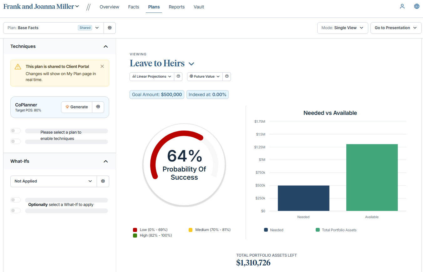 Today’s advisors need quick, consolidated visibility into the assumptions and what‑if scenarios clients explore beyond their base plan. This update delivers that clarity, enabling more efficient and focused conversations.