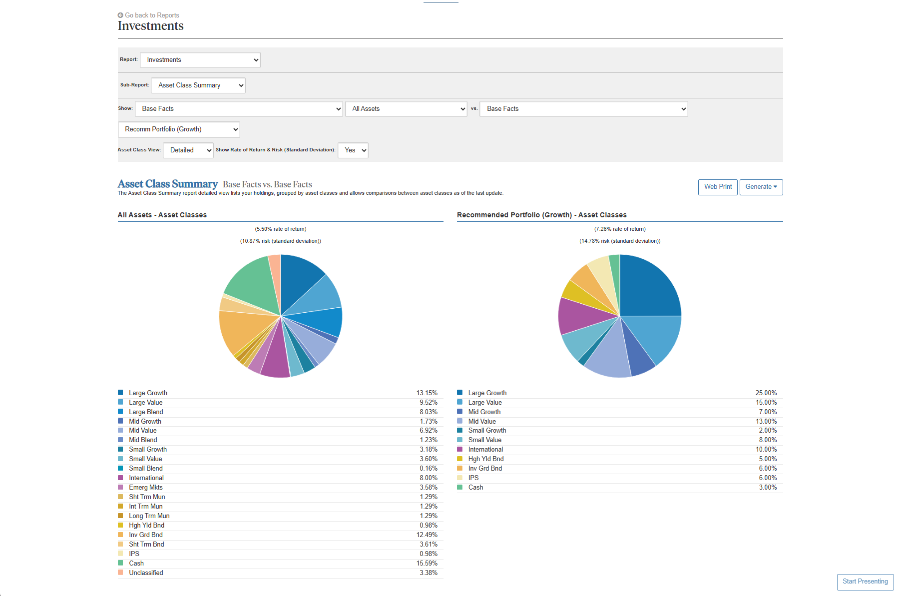 Provide a clearer, more modernized way to present and demonstrate the impact of your recommendations with the new Comparison Mode within the Asset Class Summary Report.
